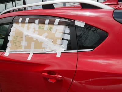 実は昨日の嵐の突風で何かが飛んできたのかガラスに当たって割れたようで、リアのガラス2枚を交換して欲しいとのご依頼でした