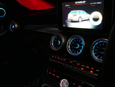 アンビエントライトのカラー変更は純正のコマンドにて操作が可能です。もちろんエアコンの吹き出し口も全く問題なくスムースに動作いたします。ちなみに設定車種はご覧いただいているW205のCクラスとGLCに対応いたしますが、近日中に64色(205後期、W213)に対応した商品も追加されるそうです
