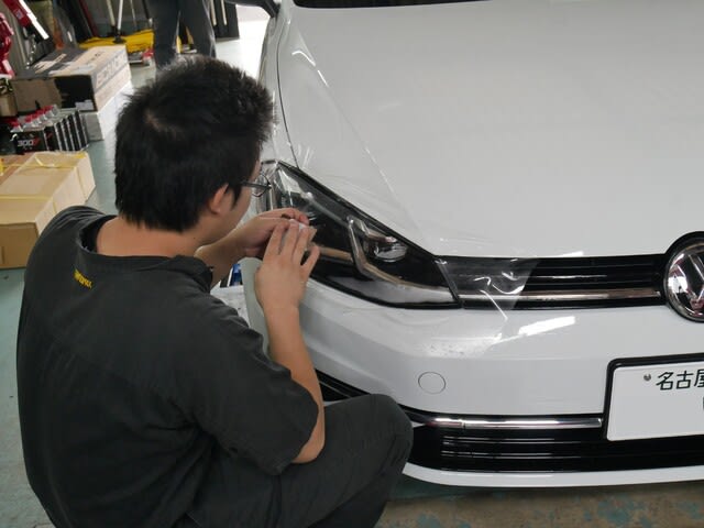 今回はGOLF、BMWともに透明なプロテクションフィルムを施工させて頂きます。スモークタイプでは色が付いているので、施工後においては見た目もりりしくなりやったという達成感もあります。ただしスモークは2年ほどで色も落ち、光量も落ちたりと再施工が必要となります。