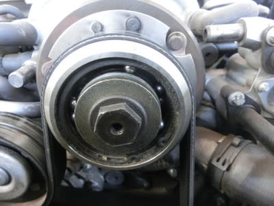 そして車検時に発見したスーパーチャージャーコンプレッサーのベアリングの半分ほど、飛んでしまい無いのが見えます。この車両においてはさほど珍しい事ではありませんが、このまま放っておくと最悪の事態が起こります。これを直すに当たってはプーリー本体を純正品に交換するしかありませんが、純正パーツだとプーリーだけでも30万円