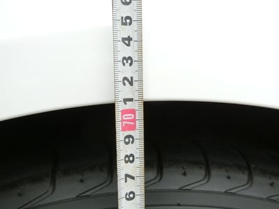 サスペンション交換前のオリジナルの状態で、タイヤ接地面よりホイールアーチ上部まで713mmであったのに対し、交換後では695mmとマイナス18mmとなりました。