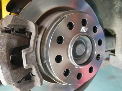 ホイールはとりあえず純正のままとなるため、車高を落とすことでタイヤがホイールハウス内側に入ることを恐れ、前後に“iiD”のスペーサーをセットします。
